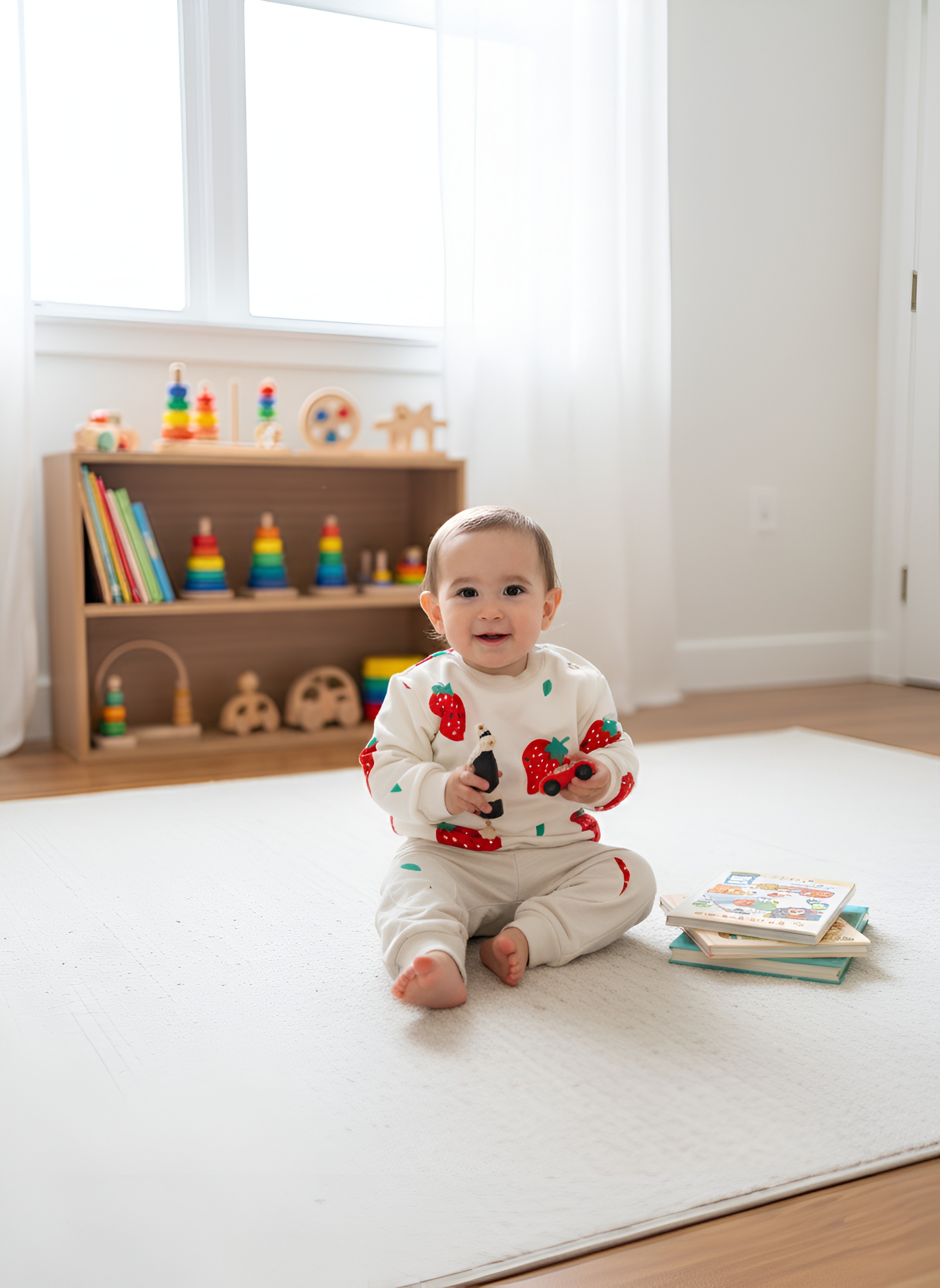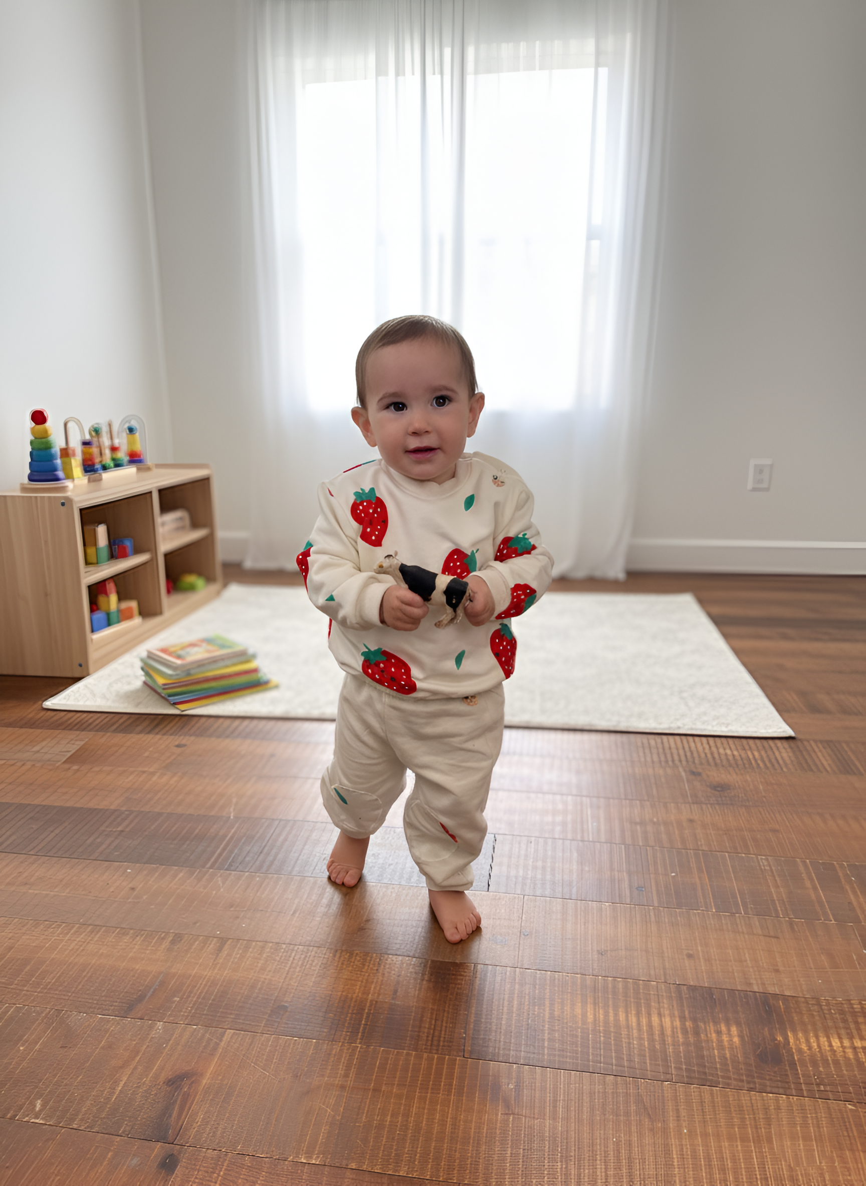 Il tessuto felpato in 100% cotone biologico è morbido, traspirante e delicato sulla pelle, pensato per accompagnare i movimenti dei più piccoli in totale libertà.